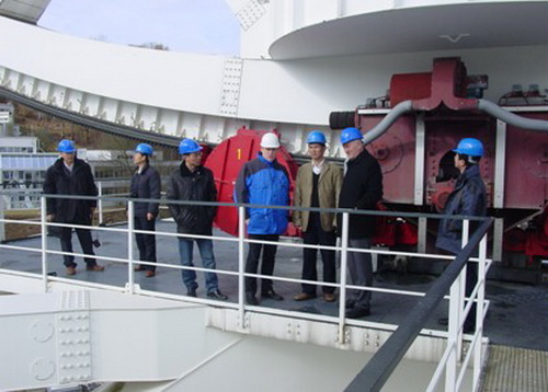 在马普射电天文研究所,詹文龙副院长一行受到了所长Kramer教授、Menten教授以及名誉所长Wielebinski教授的热烈欢迎。在了解了马普射电所的概况之后,詹文龙一行在实验室主任Keller博士的引导下考察了马普射电所的馈源和接收机实验室以及机械部件加工车间,了解了大射电望远镜需要的各种基础设施支持系统。之后,詹文龙一行在Wielebinski教授陪同下,访问了位于波恩郊区的Effelsberg天文台。在台长Kraus博士的介绍和引导下,詹文龙考察了Effelsberg 100米射电望远镜。从地下的数据线传输系统到望远镜机械主体,从接收机高频仓和天线“锅底”,到望远镜的控制室、后端数字机房和电磁屏蔽室,詹文龙详细地了解和调研了这个40年前建造的大射电望远镜的各种关键技术指标。Wielebinski教授详细介绍了德国100米射电望远镜多年来作为世界第一大射电望远镜的建造过程和各种更新过程以及该望远镜取得的各种科研成就,詹文龙就中国和世界的大射电望远镜建设的科学前景等问题与Wielebinski教授进行了讨论。