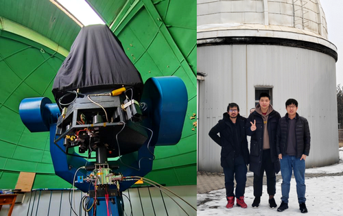 图3:安装了9k×9k CCD相机的兴隆站80cm望远镜(左)和相机研制人员合影(右)