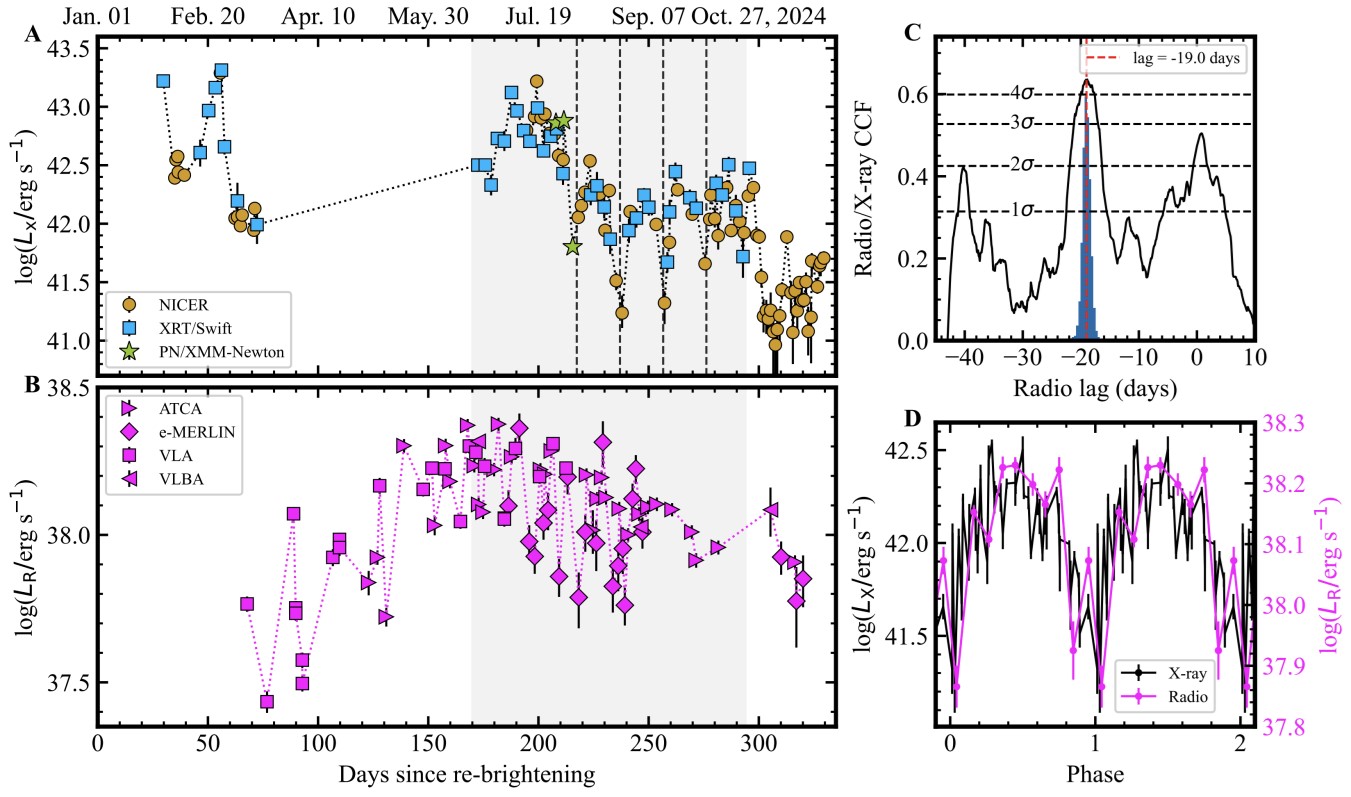 系统分析显示:在光学发现该TDE 215天后,X射线出现周期约19.6天、振幅超10倍的显著准周期性振荡;射电波段也呈现振幅超4倍的同步变化。论文第一作者、国家天文台研究员王亚楠指出:“这种跨波段、强振幅、准周期的同步变化,强烈暗示吸积盘与喷流之间存在刚性连接,像陀螺一样围绕黑洞自转轴进动。”