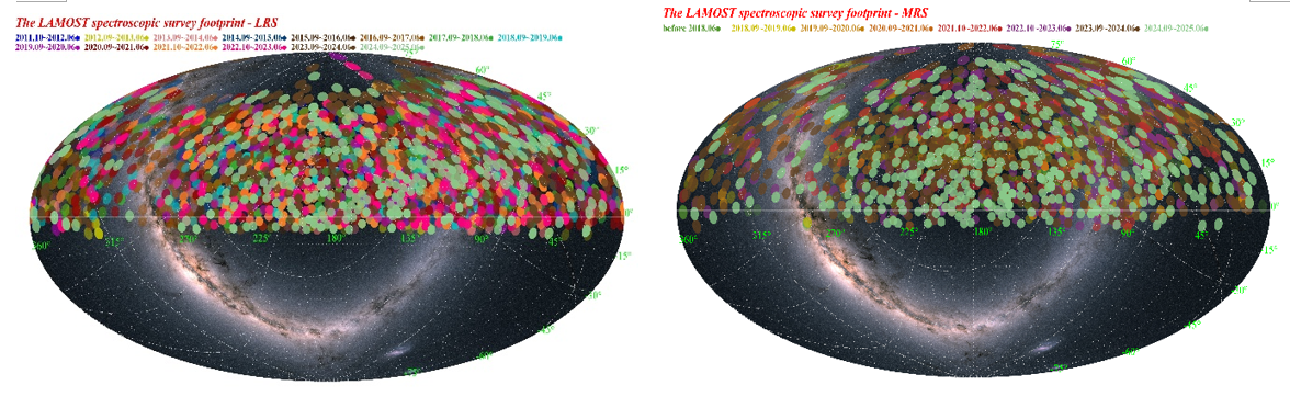 左图为LAMOST DR13的低分辨率天区覆盖图,右图为DR13的中分辨率天区覆盖图