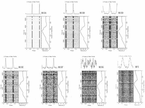 图3:观测和信号筛选方法示例;每一个子图都标注了脉冲星名称或者RFI。因为在观测中移动望远镜指向的原因,具有空间特征的信号在观测中消失又出现,即途中间断的竖线;而较弱的脉冲星,如M15G或者RFI则无此特征。