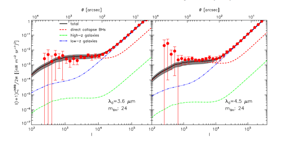 理论计算的第一代黑洞对红外背景辐射的角功率谱的贡献及实测值,左图为在波长3.6微米上的角功率谱,右图为4.5微米波长处的角功率谱。