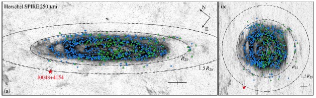 这项奇特的发现并非偶然,而是该研究团队长期致力于仙女星系(M31)系统性研究的成果之一。相关的一系列研究成果均是基于LAMOST对仙女星系及其周围天区的大规模光谱巡天的数据。在早前发表于《天文学杂志》(Chen, et al .,2025, AJ, 169,174)的一项工作中,研究团队利用机器学习和精细的光谱分析方法,构建了全面的M31天体光谱证认星表。该星表包含了上千个发射线星云、星团和超巨星等珍贵天体,为在仙女星系中搜寻罕见的奇特天体奠定了坚实的数据基础。正是得益于这个星表,研究团队不仅发现了上述的极亮变星LAMOST J0041+3948,还找到了另一颗名为LAMOST J0048+4154的大质量黄超巨星(图2)。这颗黄超巨星位于仙女座星系盘的遥远外侧,距离星系中心约34千秒差距,远超传统理论认为的大质量恒星的形成区域。这颗大质量黄超巨星的发现挑战了“大质量恒星只能在星系内部的稠密环境中形成”的传统认识,证明了即使在星系外围的稀疏区域,依然可能存在形成大质量恒星的条件。这项成果同样发表于《天文学杂志》(Chen, et al., 2025, AJ, 170 ,89)。
